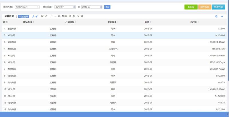 功能介绍:满足用户对企业各产品产量、能耗的历史数据进行多角度查询的需要,允许用户自行定制查询条件(包括自定义区域、自定义产品、自定义能耗类型、自定义时间频率、自定义数据类型等),并支持自定义查询方案的编辑,手动录入和自动计算的数据都在查询的范围之内。