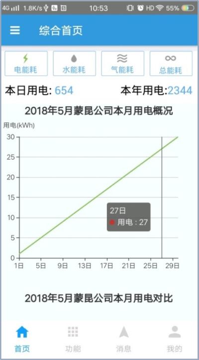 用户在手机页面查看关心的每个区域的用能数据简报, 系统默认根据不同用户的角色,提供不同的区域以及简报内容。