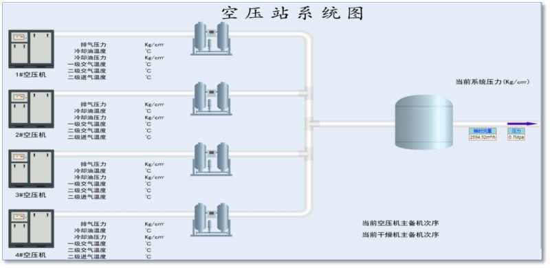 Ø 空压机群管理:实时检测空压机排气压力温度、运行状况,依据用气情况合理控制空压机运行数量,平衡空压机运行时间。对空压机运行异常进行报警,并对空压机运行情况进行记录、存储。